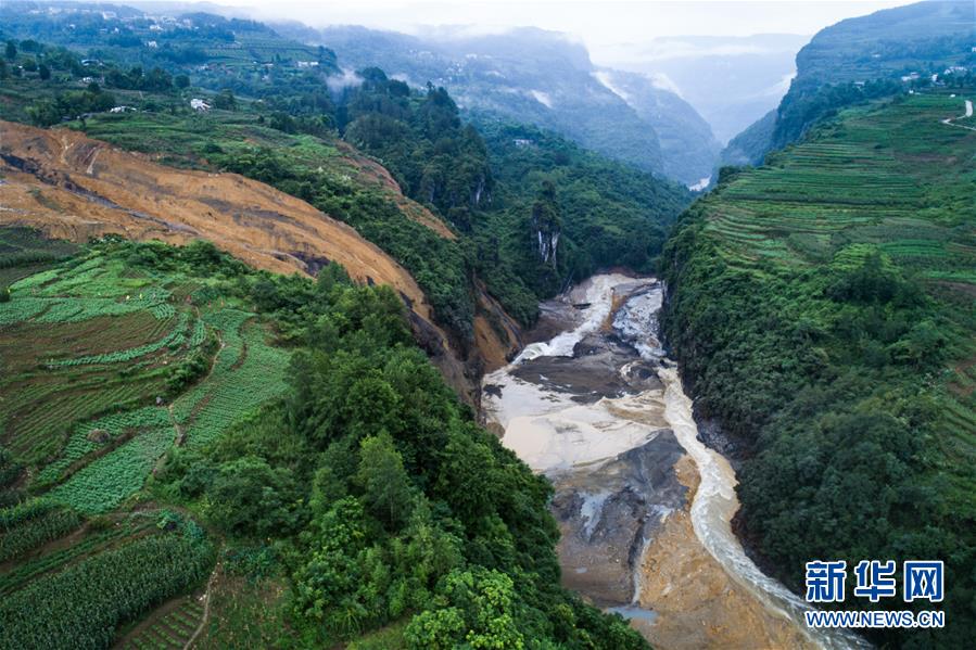 7月22日拍攝的因恩施州屯堡鄉(xiāng)馬者村山體滑坡形成的堰塞湖(無人機照片)。