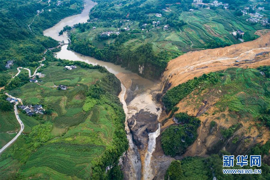 7月22日拍攝的因恩施州屯堡鄉(xiāng)馬者村山體滑坡形成的堰塞湖(無人機照片)。新華社記者肖藝九攝