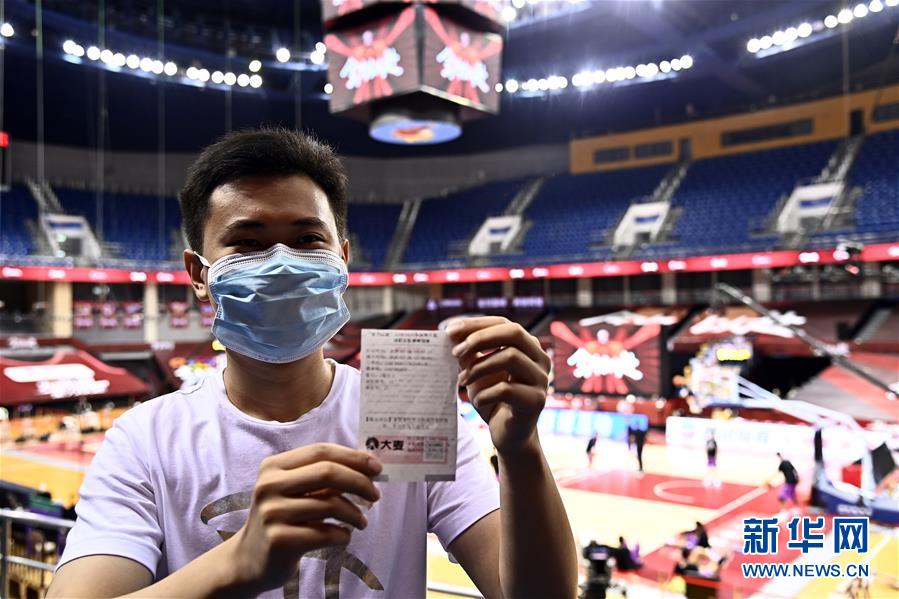 7月26日,在青島國信體育館,蘇柯帆展示著自己的紙質(zhì)球票。他成為CBA聯(lián)賽復(fù)賽允許觀眾現(xiàn)場觀賽后,首位進(jìn)場的觀眾。當(dāng)日,在山東青島舉行的2019-2020賽季中國男子籃球職業(yè)聯(lián)賽(CBA)復(fù)賽第二階段(嶗山賽區(qū))比賽中,醫(yī)護(hù)人員、教師、公安戰(zhàn)線人士通過官方購票平臺,完成包括核酸檢測在內(nèi)的相關(guān)流程后進(jìn)場觀看了上海久事隊(duì)迎戰(zhàn)山東西王隊(duì)的比賽。觀賽期間,觀賽者須全程佩戴口罩,對號入座,嚴(yán)格保持間隔一米就座。退場時(shí),觀眾須按照自后向前、先兩邊后中間的順序,保持“一米線”社交距離有序退場。新華社記者 郭緒雷 攝