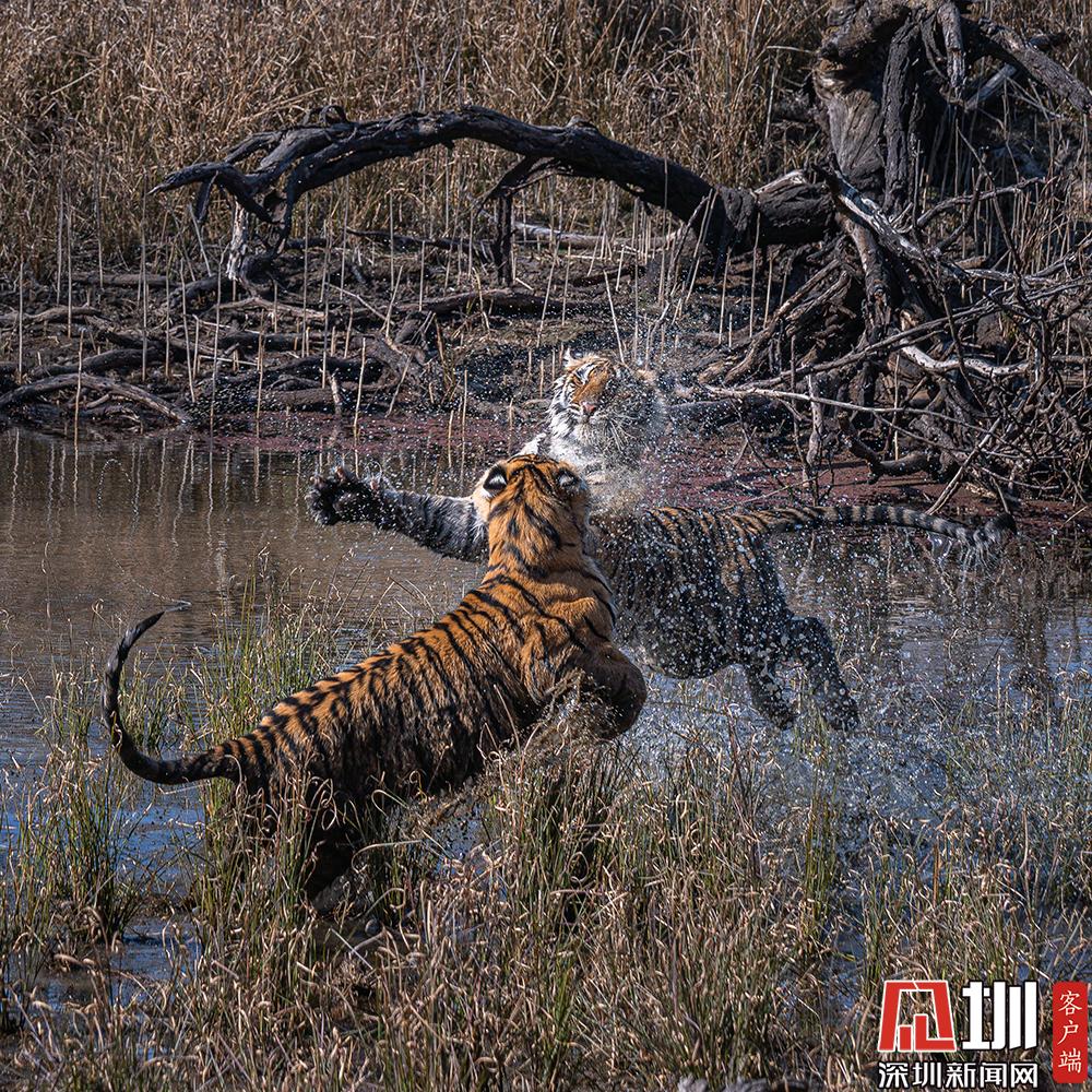 2020年7月27日,猛虎斗有多壯觀?來自印度德里的41歲職業(yè)業(yè)攝影師Nitish Madan,在在印度北部倫滕波爾國家公園游覽時,見證了兩只老虎幼崽激烈的水上爭奪戰(zhàn)。從畫面中可以看到,兩只足足有200磅重的孟加拉虎,面對面互相咆哮,伸出虎爪兇猛至極,才15個月大就已經(jīng)有了王者風(fēng)范。