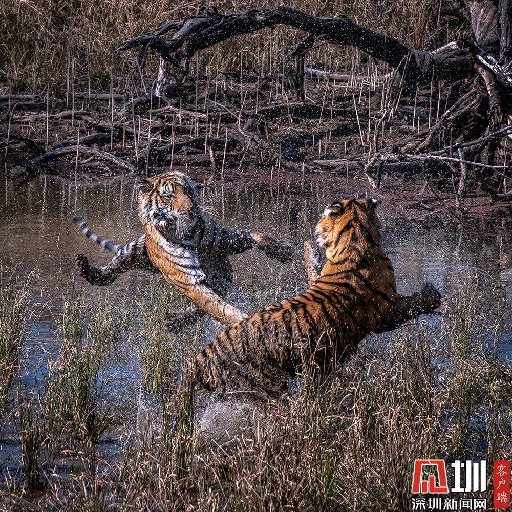 2020年7月27日,猛虎斗有多壯觀?來(lái)自印度德里的41歲職業(yè)業(yè)攝影師Nitish Madan,在在印度北部倫滕波爾國(guó)家公園游覽時(shí),見(jiàn)證了兩只老虎幼崽激烈的水上爭(zhēng)奪戰(zhàn)。從畫(huà)面中可以看到,兩只足足有200磅重的孟加拉虎,面對(duì)面互相咆哮,伸出虎爪兇猛至極,才15個(gè)月大就已經(jīng)有了王者風(fēng)范。