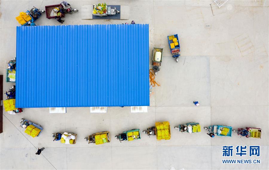 在寧夏紅寺堡區(qū)柳泉鄉(xiāng)柳泉村黃花菜晾曬場(chǎng),村民排隊(duì)稱重黃花菜(7月11日攝,無(wú)人機(jī)照片)。新華社記者 楊植森 攝