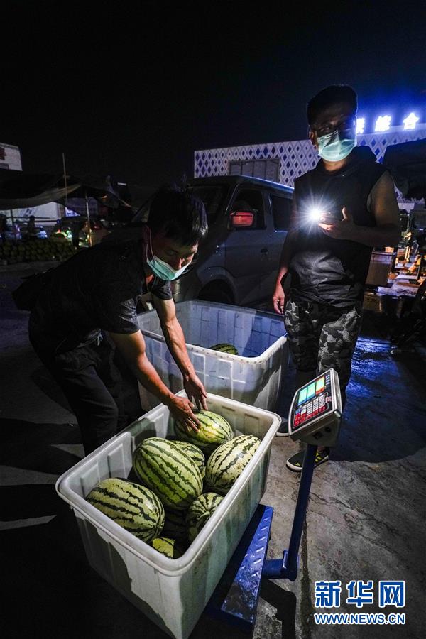 7月26日,在烏魯木齊新聯(lián)農(nóng)副產(chǎn)品綜合市場(chǎng)內(nèi),烏魯木齊市一小區(qū)志愿者(右)在幫助小區(qū)居民采購(gòu)西瓜。新華社記者 趙戈 攝