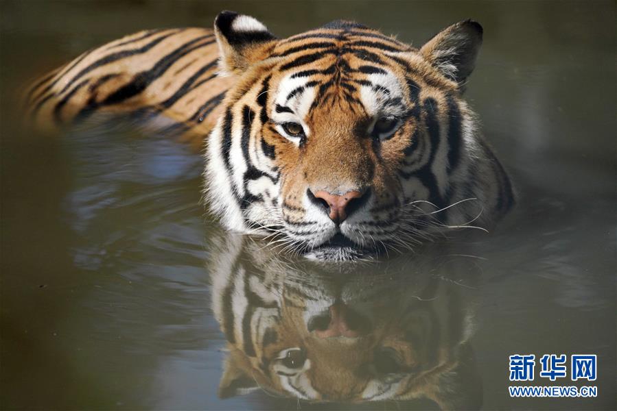 7月28日在橫道河子?xùn)|北虎林園拍攝的在水中納涼的東北虎。時值盛夏,位于黑龍江省海林市的橫道河子?xùn)|北虎林園的東北虎活動量減少,以不同方式消夏納涼。新華社記者王建威攝