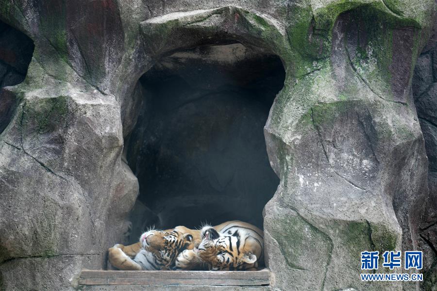 在橫道河子?xùn)|北虎林園,東北虎在休息(7月27日攝)。時值盛夏,位于黑龍江省海林市的橫道河子?xùn)|北虎林園的東北虎活動量減少,以不同方式消夏納涼。新華社記者王建威攝