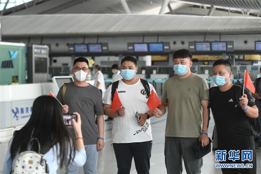 7月29日,在杭州蕭山國際機場,電力工程技術人員在進入安檢通道前合影。當日,中國能源建設集團浙江火電建設有限公司的113名電力工程技術人員在杭州蕭山國際機場集結,啟程飛赴印度尼西亞首都雅加達。他們將重新投入到印尼多個“一帶一路”重點工程的建設中。新華社記者黃宗治攝