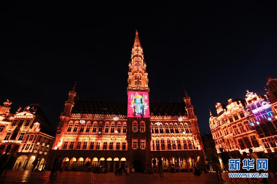 7月29日,人們?cè)诒壤麜r(shí)布魯塞爾大廣場(chǎng)欣賞聲光秀,市政廳外墻上投射出“鮮花時(shí)光”的字樣。7月29日,比利時(shí)布魯塞爾大廣場(chǎng)舉行大型聲光秀。藝術(shù)家在市政廳等歷史建筑上投影文字和圖案,紀(jì)念這個(gè)夏天受新冠疫情影響而不能如期舉辦的文化活動(dòng)。新華社記者鄭煥松攝
