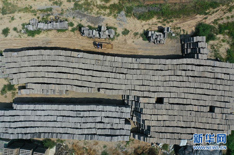 7月30日,河北省任丘市出岸鎮(zhèn)古建磚廠工人在搬運(yùn)磚坯(無人機(jī)照片)。