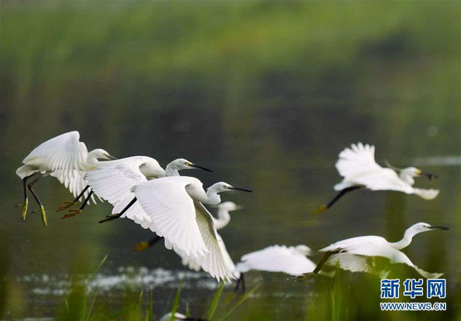 8月3日,白鷺在唐山南湖公園飛舞。近日,大批鷺鳥飛抵河北唐山南湖公園,在此覓食、嬉戲。唐山南湖公園所在地曾是因采煤沉降形成的廢棄地,經(jīng)綜合治理,成為一座水域面積11.5平方公里、綠地面積16平方公里的生態(tài)公園。新華社記者楊世堯攝