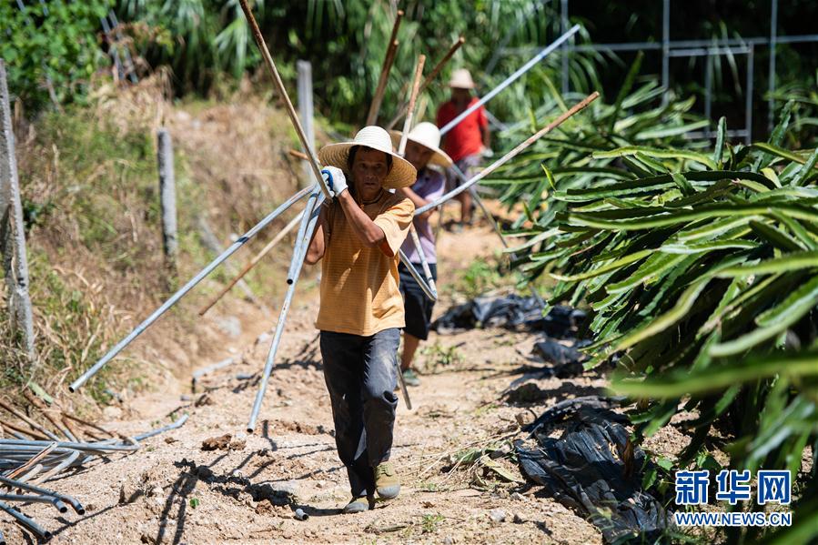 受近期多輪強(qiáng)降水引發(fā)的山洪影響,位于湖南省保靖縣碗米坡鎮(zhèn)首八峒村的易甸園水果有限公司種植基地大棚內(nèi)上百株火龍果枝條受損,當(dāng)?shù)卮迕裾ゾo搶修大棚,降低災(zāi)害損失。新華社記者李鑫攝