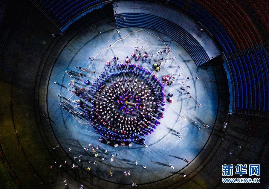 演員在苗族大型山水實(shí)景演出《西江盛典》中表演(7月30日攝,無人機(jī)照片)。新華社記者陶亮攝