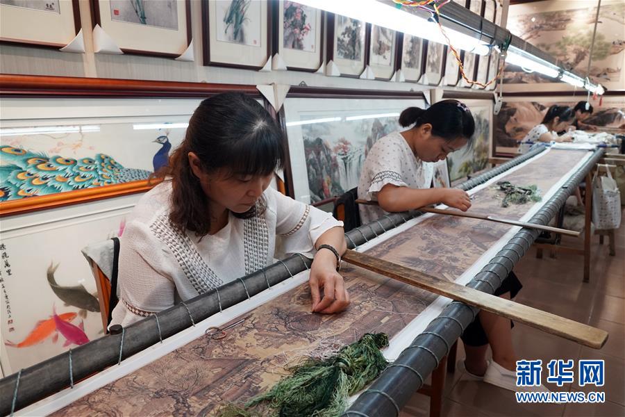 在開封市素花宋繡工藝有限公司的展示館里,王素花的徒弟們在刺繡(7月30日攝)。新華社記者李嘉南攝