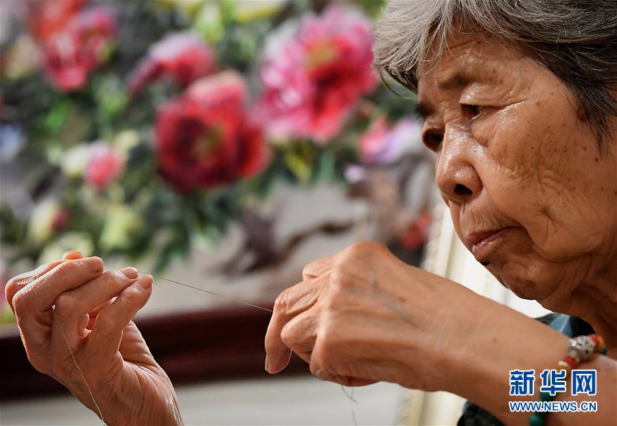 在開封市素花宋繡工藝有限公司的展示館里,王素花在劈線(7月30日攝)。新華社記者李安攝