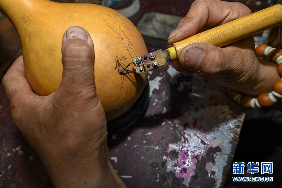8月5日,侯景偉在葫蘆上進行創(chuàng)作。今年55歲的吉林四平人侯景偉自幼與家人學習雕刻、烙畫藝術。經(jīng)過多年潛心研究,他將浮雕和烙畫工藝相結合,通過拋光、起稿、雕刻、烙燙、套色等十余道工藝,制作展現(xiàn)傳統(tǒng)文化、民俗故事的葫蘆工藝品。2020年,侯景偉被評為四平市非物質(zhì)文化遺產(chǎn)項目侯氏葫蘆雕刻烙畫代表性傳承人。他說:“希望有更多人加入到非遺傳承隊伍中,讓小葫蘆‘講’出更多民俗故事。”新華社記者張楠攝