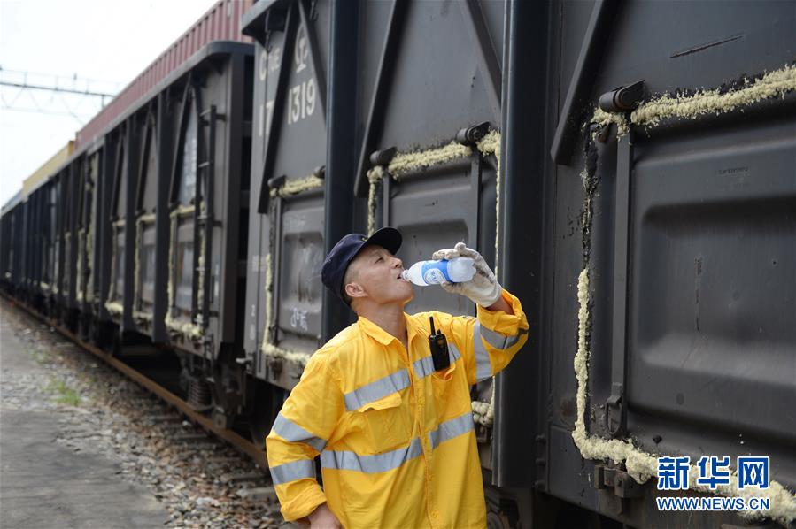 8月6日,合肥運(yùn)用車(chē)間列車(chē)檢修員在工作間隙喝水。合肥市近日持續(xù)高溫天氣。在中國(guó)鐵路上海局集團(tuán)有限公司杭州北車(chē)輛段合肥運(yùn)用車(chē)間,386名列車(chē)檢修工人頭頂烈日?qǐng)?jiān)守崗位,確保暑運(yùn)列車(chē)的安全運(yùn)行。據(jù)了解,暑運(yùn)期間,合肥運(yùn)用車(chē)間日均檢修列車(chē)105列,檢修車(chē)廂5058節(jié)。新華社記者黃博涵攝