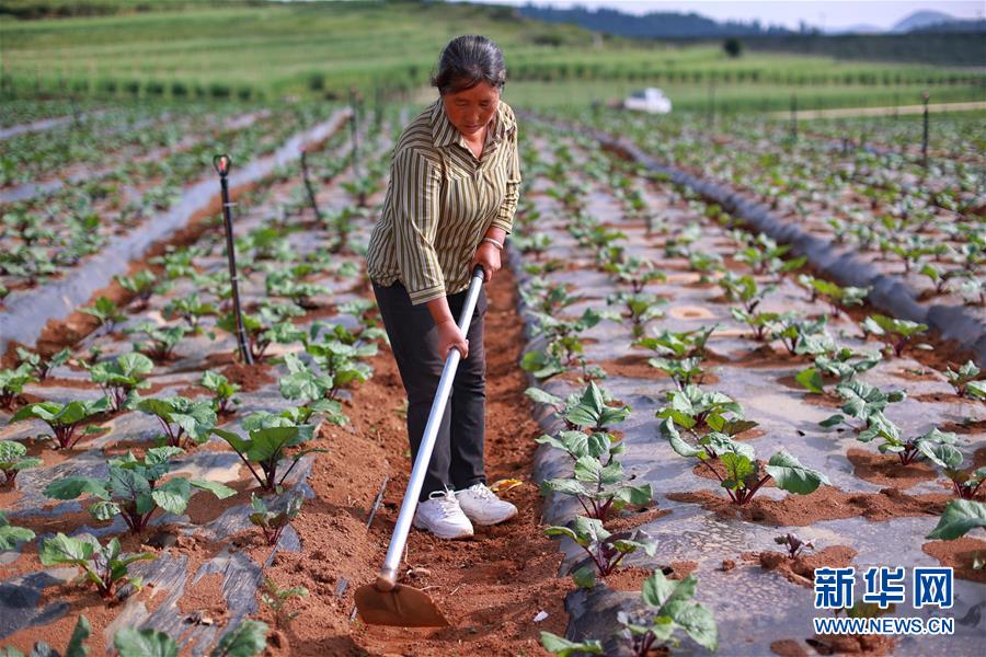 8月6日,村民在威寧縣草海鎮(zhèn)中海社區(qū)蔬菜基地種植紅菜苔。新華社記者劉續(xù)攝