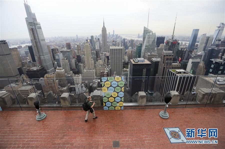 8月6日,在美國(guó)紐約,一名攝影師在洛克菲勒中心觀景臺(tái)上參觀。當(dāng)日,3月份暫時(shí)關(guān)閉的洛克菲勒中心觀景臺(tái)恢復(fù)對(duì)公眾開放。每天13時(shí)至21時(shí),人們可戴口罩前往參觀。新華社記者王迎攝