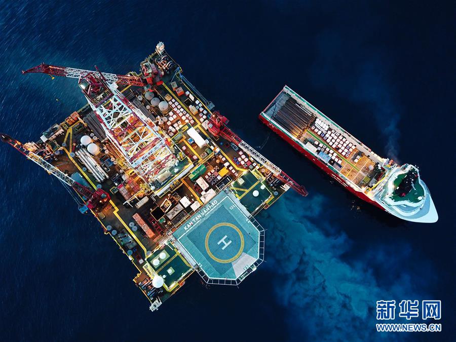 這是7月29日拍攝的正在南海北部海域進(jìn)行鉆探作業(yè)的勘探三號(hào)鉆井平臺(tái)和為其運(yùn)送物資的拖船(無人機(jī)照片)。新華社記者蒲曉旭攝