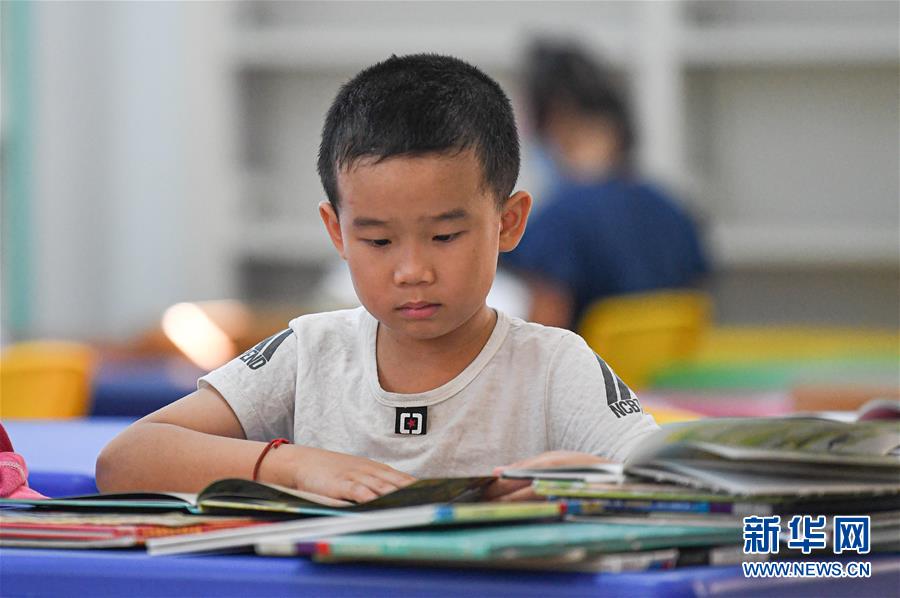 8月8日,小朋友在位于海口的海南省圖書館閱讀書籍。暑假期間,許多小朋友來到海南省圖書館閱讀書籍,在書香中度過快樂暑假。新華社記者 蒲曉旭 攝