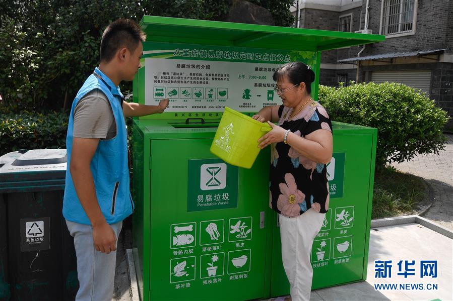 8月9日,湖州市吳興區(qū)八里店鎮(zhèn)百合苑居民(右)投放易腐垃圾。近年來,浙江省通過創(chuàng)新宣傳教育,多措并舉促進(jìn)垃圾分類投放、收運(yùn)及處置的良性循環(huán),引領(lǐng)垃圾分類成為城鄉(xiāng)居民的生活新風(fēng)尚。新華社記者黃宗治攝。