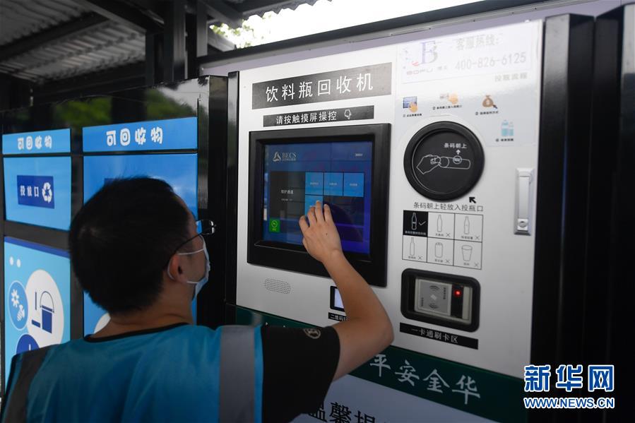 網格員在金華市金東區(qū)東孝街道一處垃圾分類投放點操作飲料瓶回收機(7月16日攝)。近年來,浙江省通過創(chuàng)新宣傳教育,多措并舉促進垃圾分類投放、收運及處置的良性循環(huán),引領垃圾分類成為城鄉(xiāng)居民的生活新風尚。新華社記者黃宗治攝。