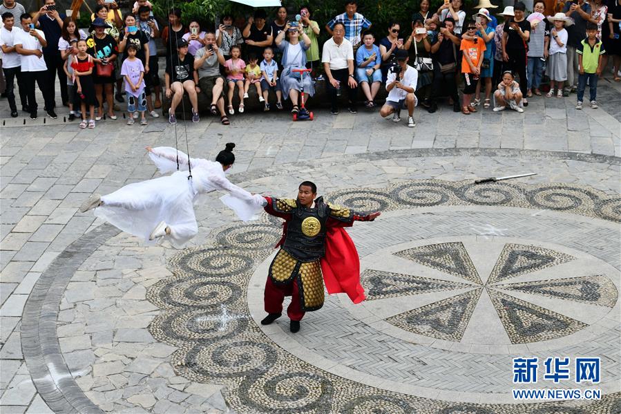 8月8日,游客在貴州省龍里縣“龍門鎮(zhèn)”武俠文化主題景區(qū)觀看武俠劇表演。近日,貴州省黔南布依族苗族自治州龍里縣境內(nèi)氣候宜人,龍里油畫大草原、“龍門鎮(zhèn)”武俠文化主題景區(qū)等景點吸引眾多游客前來觀光旅游。新華社記者楊文斌攝。
