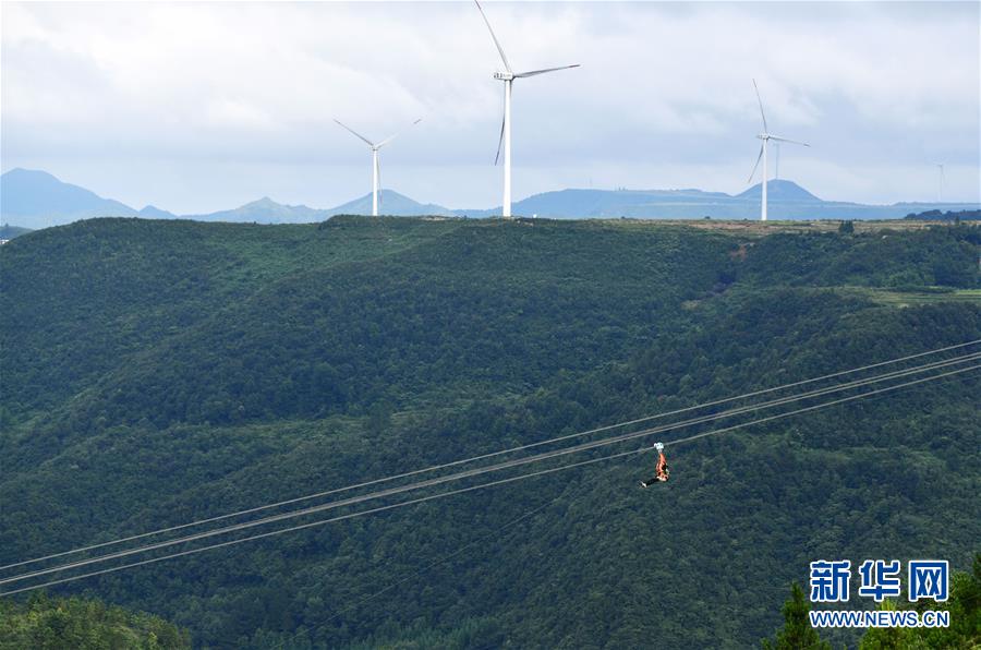 8月8日,游客在貴州省龍里油畫大草原乘坐滑索觀光。近日,貴州省黔南布依族苗族自治州龍里縣境內(nèi)氣候宜人,龍里油畫大草原、“龍門鎮(zhèn)”武俠文化主題景區(qū)等景點吸引眾多游客前來觀光旅游。新華社記者楊文斌攝。