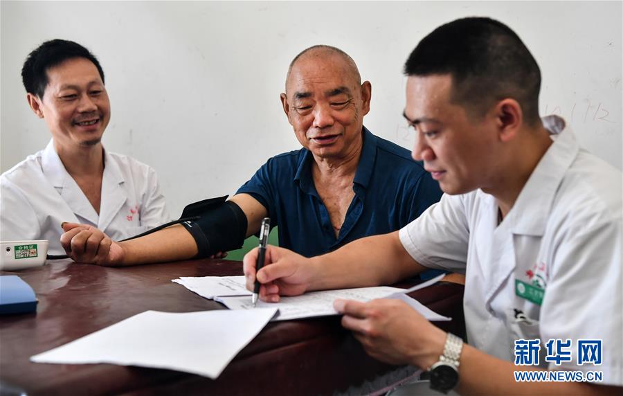 陜西安康市嵐皋縣佐龍鎮(zhèn)中心衛(wèi)生院的醫(yī)生在佐龍村對(duì)家庭醫(yī)生簽約服務(wù)對(duì)象進(jìn)行慢性病隨訪(7月30日攝)。目前,嵐皋縣組建了71個(gè)鎮(zhèn)級(jí)家庭醫(yī)生服務(wù)團(tuán)隊(duì)、15個(gè)縣級(jí)技術(shù)指導(dǎo)團(tuán)隊(duì),對(duì)貧困群眾開(kāi)展重點(diǎn)人群免費(fèi)體檢、慢病隨訪、健康生活指導(dǎo)、健康扶貧政策宣傳等簽約服務(wù)項(xiàng)目。新華社記者劉瀟攝。