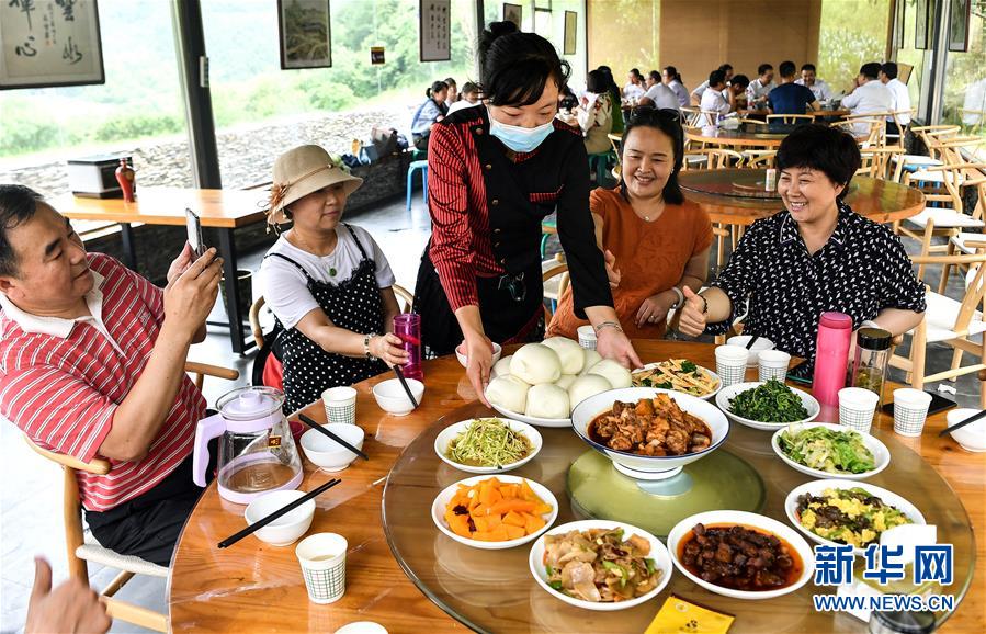 游客在陜西寶雞市太白縣咀頭鎮(zhèn)白云村的一家農(nóng)家樂(lè)里就餐(7月5日攝)。白云村是秦嶺深處的小山村,2016年建檔立卡貧困戶303人。近年來(lái),為了徹底改變貧困面貌,白云村依靠當(dāng)?shù)匾郎桨牡赜騼?yōu)勢(shì),全面提升人居環(huán)境和村容村貌,發(fā)展鄉(xiāng)村旅游,讓群眾持續(xù)增收。目前,白云村已實(shí)現(xiàn)整體脫貧,2019年全村人均純收入12880元。新華社記者劉瀟攝。