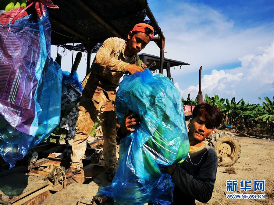 7月16日,在柬埔寨桔井省的柬埔寨—中國(guó)熱帶生態(tài)農(nóng)業(yè)合作示范區(qū)內(nèi),工人搬運(yùn)剛剛收獲的香蕉(手機(jī)拍攝)。新華社記者毛鵬飛攝。
