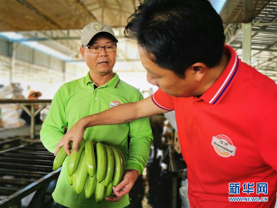 7月16日,在柬埔寨桔井省的柬埔寨—中國熱帶生態(tài)農(nóng)業(yè)合作示范區(qū)內(nèi),綠洲農(nóng)業(yè)發(fā)展(柬埔寨)有限公司總經(jīng)理高冠華(右)和公司香蕉產(chǎn)業(yè)技術(shù)副總監(jiān)吳誠檢查香蕉的品質(zhì)(手機拍攝)。新華社記者毛鵬飛攝。