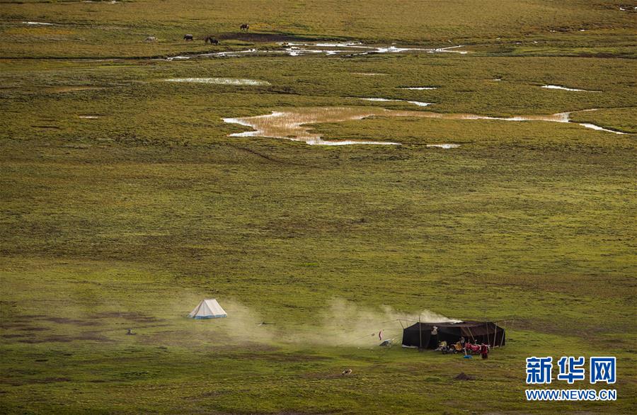 夕照下的泥拉壩濕地一角,炊煙裊裊(8月9日攝)。新華社記者江宏景攝。
