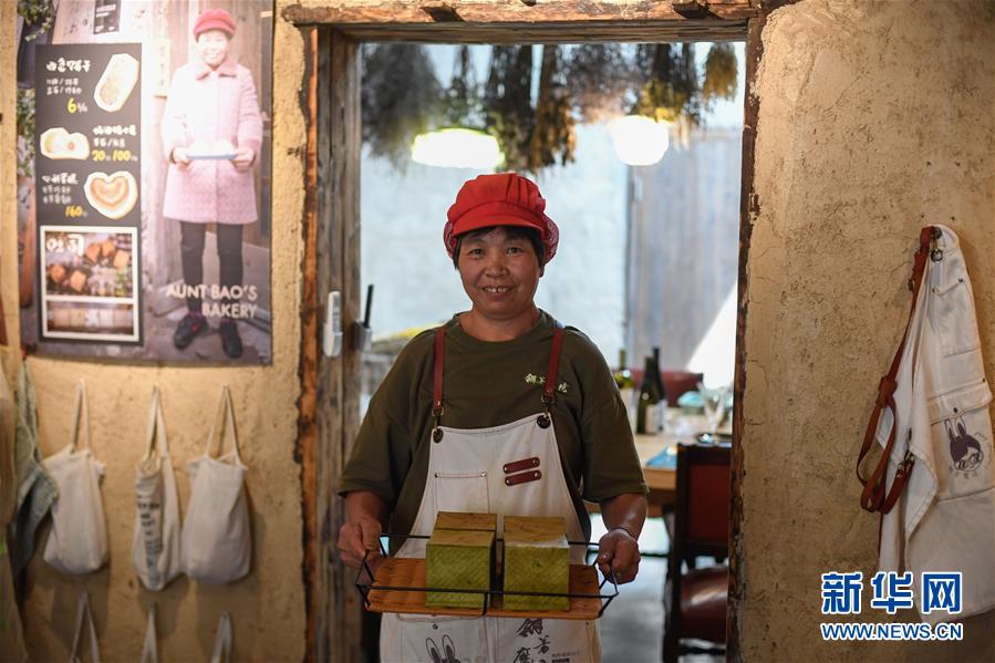 在浙江省麗水市松陽縣四都鄉(xiāng)平田村一家面包坊,村民鮑阿姨展示剛出爐的吐司面包(7月17日攝)。新華社記者黃宗治攝。