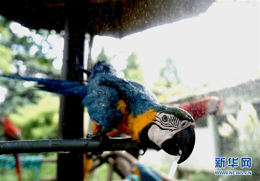 8月11日,上海動物園的金剛鸚鵡在享受噴淋降溫。當日,上海最高溫度達到35攝氏度,上海動物園開啟園內安裝的各種噴淋裝置,讓動物們防暑降溫,樂享清涼。新華社記者張建松攝