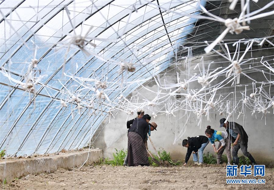 格桑旺姆(右三)與姐姐德吉卓瑪(右二)帶領(lǐng)工人在蔬菜大棚內(nèi)翻地,準備種新的蔬菜(8月3日攝)。新華社記者 李賀 攝