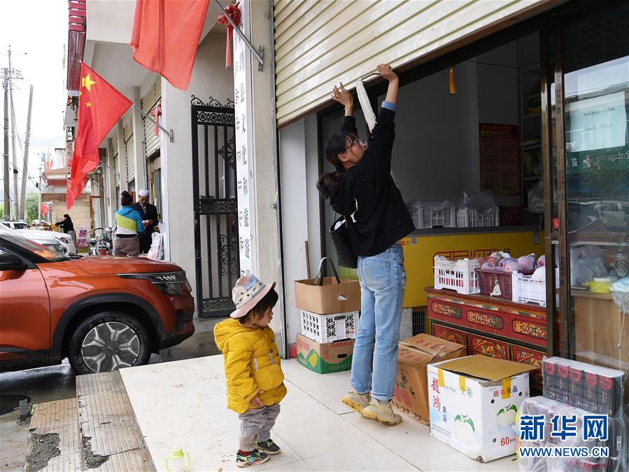 格桑旺姆推開蔬菜店的卷閘門準(zhǔn)備營(yíng)業(yè)(8月3日攝)。新華社記者 李賀 攝