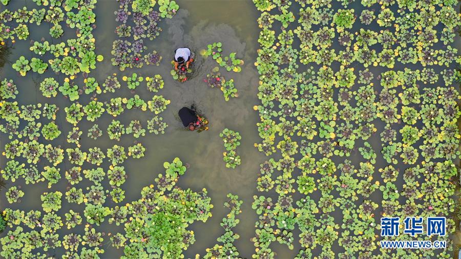 8月12日,河北省灤州市茨榆坨鎮(zhèn)草塘坨村花農(nóng)在大棚內(nèi)打理種植的蓮花(無(wú)人機(jī)照片)。新華社記者 牟宇 攝