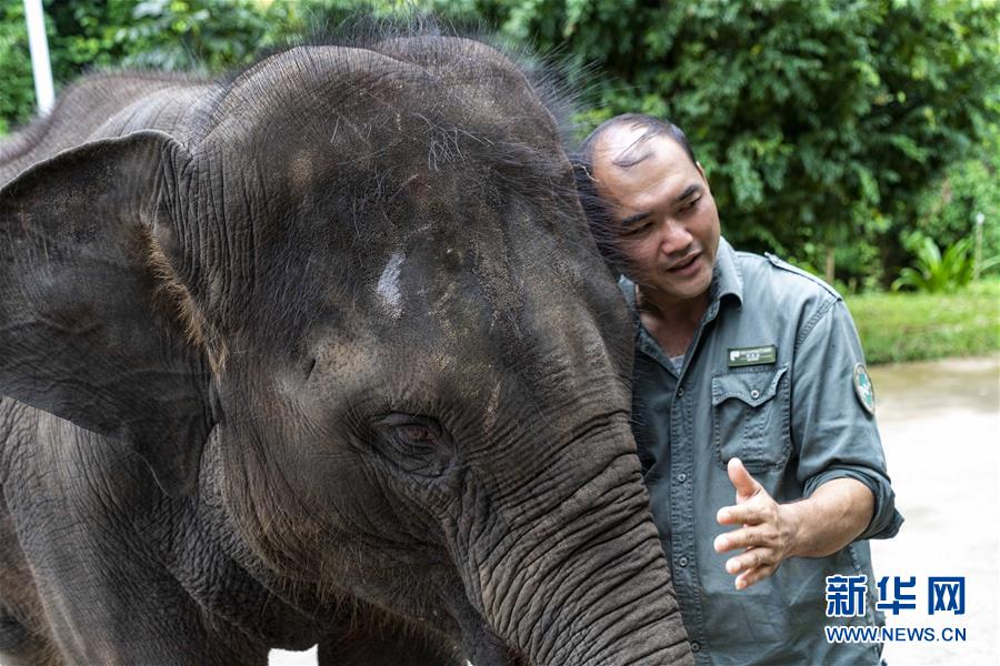 8月12日,在西雙版納傣族自治州亞洲象種源繁育及救助中心,一名“象爸爸”在和救助象“羊妞”互動。新華社記者 陳欣波 攝