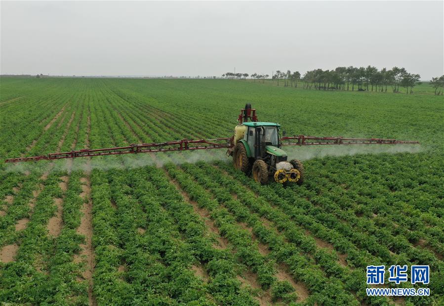 8月12日,在尚義縣三工地鎮(zhèn)有德元村,農(nóng)民使用機(jī)械設(shè)備在田間給旱作馬鈴薯噴灑農(nóng)藥(無人機(jī)照片)。