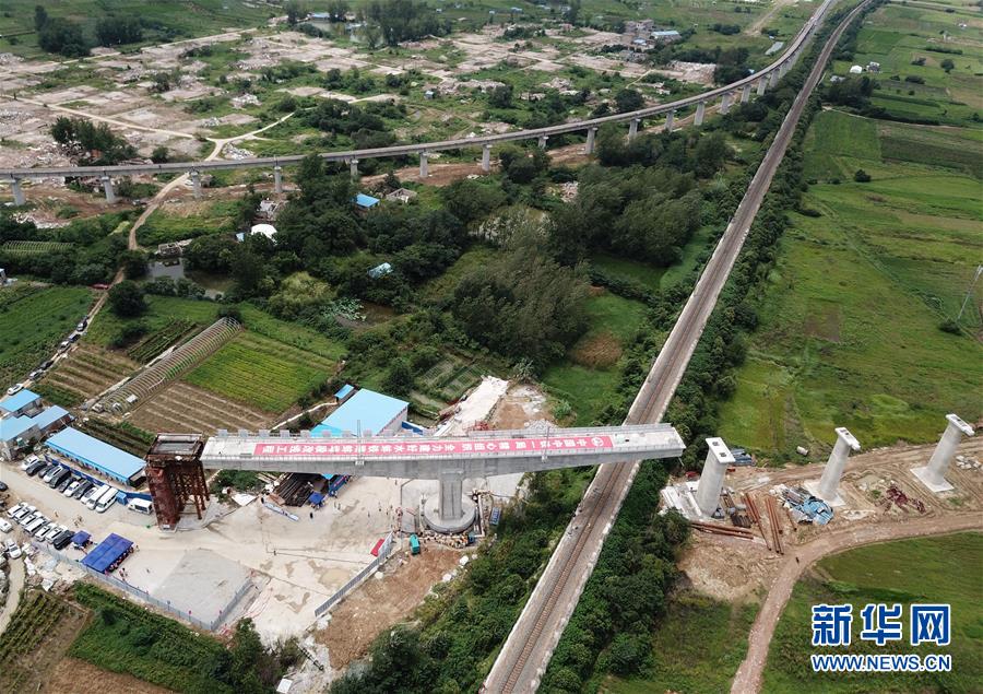 這是8月12日拍攝的水蚌鐵路蚌埠段改線工程?hào)|站疏解線特大橋跨越京滬鐵路上行線轉(zhuǎn)體梁轉(zhuǎn)體施工現(xiàn)場(chǎng)(無人機(jī)照片)。當(dāng)日,由中鐵一局承建的水蚌鐵路蚌埠段改線工程?hào)|站疏解線特大橋跨越京滬鐵路上行線64米T構(gòu)轉(zhuǎn)體梁成功實(shí)現(xiàn)轉(zhuǎn)體。新華社記者 劉軍喜 攝