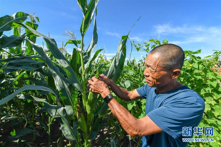 8月12日,在鎮(zhèn)賚縣黑魚泡鎮(zhèn)岔臺村,村民曲海波查看玉米長勢。新華社記者 張楠 攝