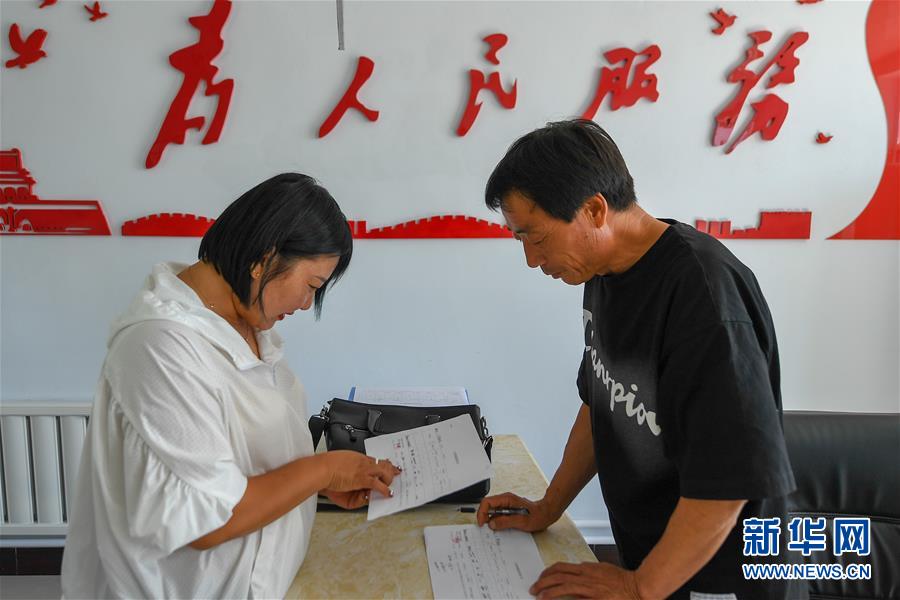 8月12日,在鎮(zhèn)賚縣黑魚泡鎮(zhèn)岔臺村,村民包春苗(左)在便民服務(wù)大廳辦業(yè)務(wù)。新華社記者 張楠 攝