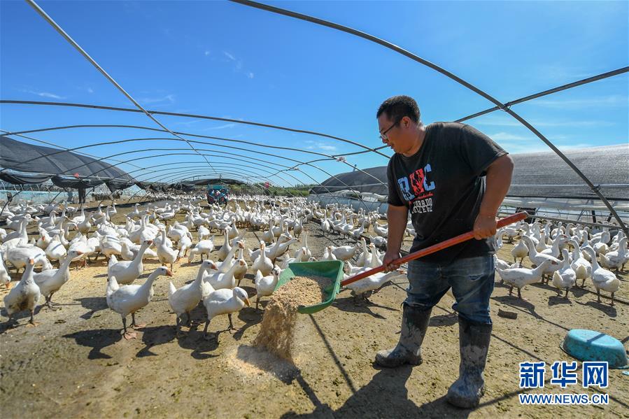 8月12日,在鎮(zhèn)賚縣黑魚泡鎮(zhèn)岔臺村,村民王木堯在投喂鵝飼料。新華社記者 張楠 攝