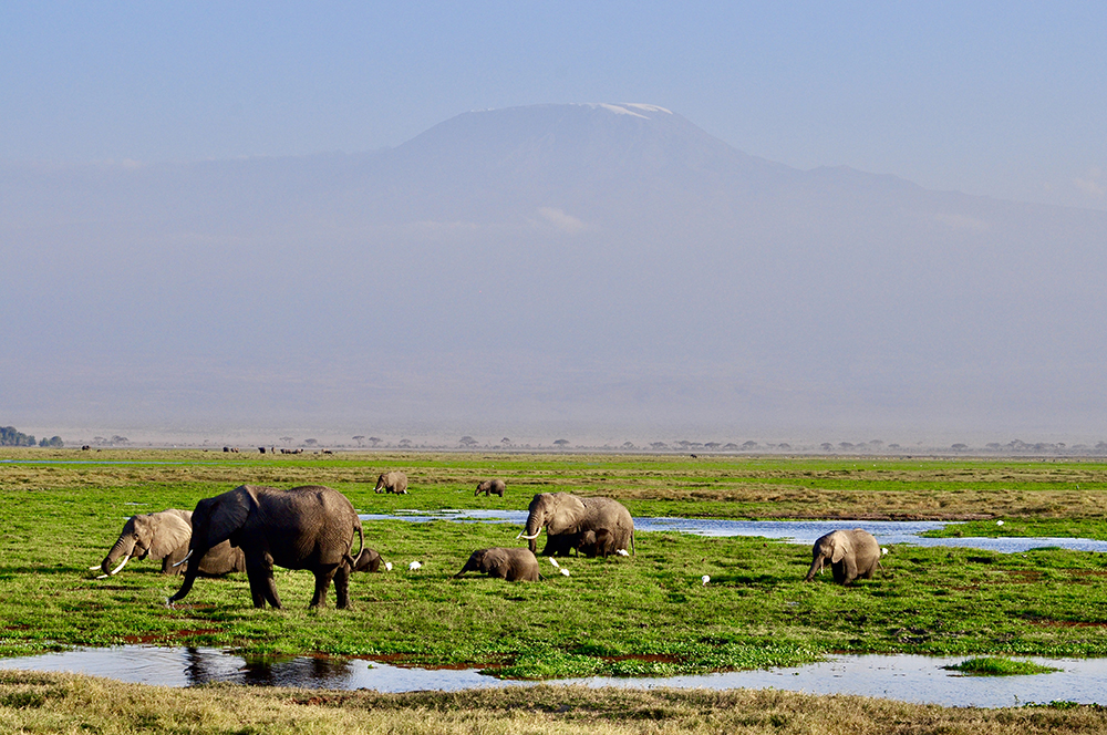 肯尼亞?wèn)|南部,與坦桑尼亞接壤的安博賽利國(guó)家公園,距內(nèi)羅畢240公里,因水草豐美而成為野生非洲大象的樂(lè)園。