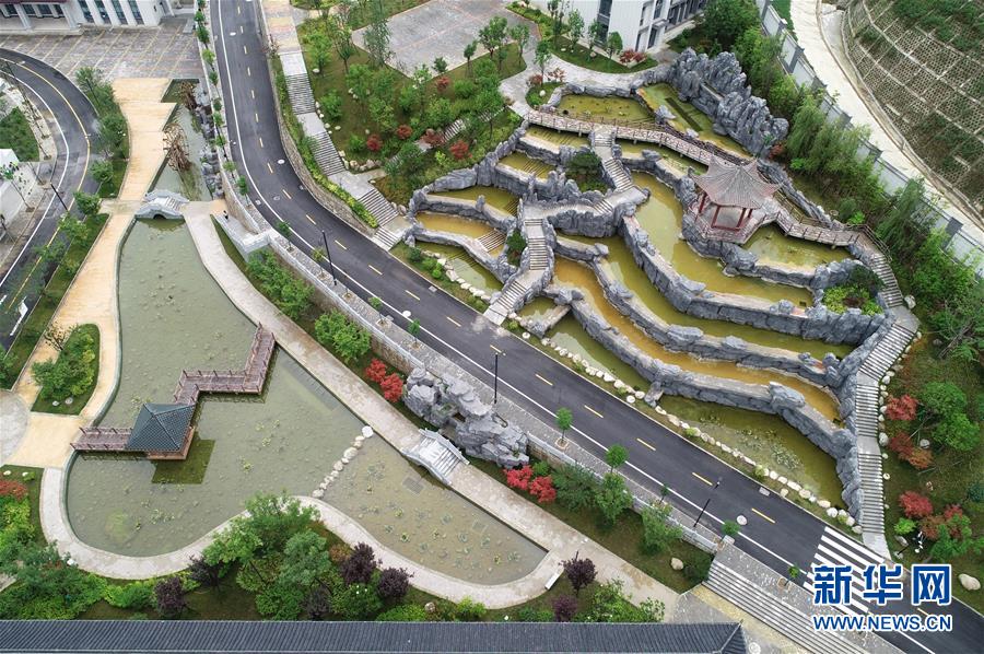 鎮(zhèn)安縣鎮(zhèn)安中學(xué)多級瀑布群與水池棧道涼亭景觀(7月30日攝,無人機照片)。新華社記者邵瑞攝