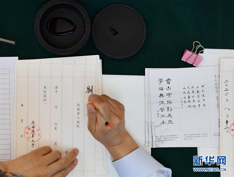 8月13日,陜西師范大學(xué)在職教師王雙懷書寫錄取通知書。當(dāng)日,陜西師范大學(xué)2020年手寫錄取通知書正式開筆。該校自2007年起采用毛筆書寫錄取通知書的方式,為新生傳遞佳音。今年,學(xué)校十余位退休教師、在職教師、校友代表等書法愛好者將為約4500名新錄取的本科生送上帶著墨香的大學(xué)錄取通知書。新華社記者張博文攝
