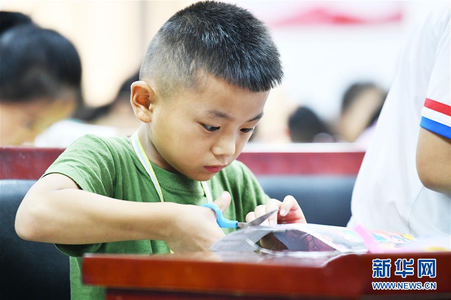 8月13日,貴州省思南縣雙塘街道麗景社區(qū)易地扶貧搬遷安置點的孩子在學習剪紙。新華社記者楊文斌攝