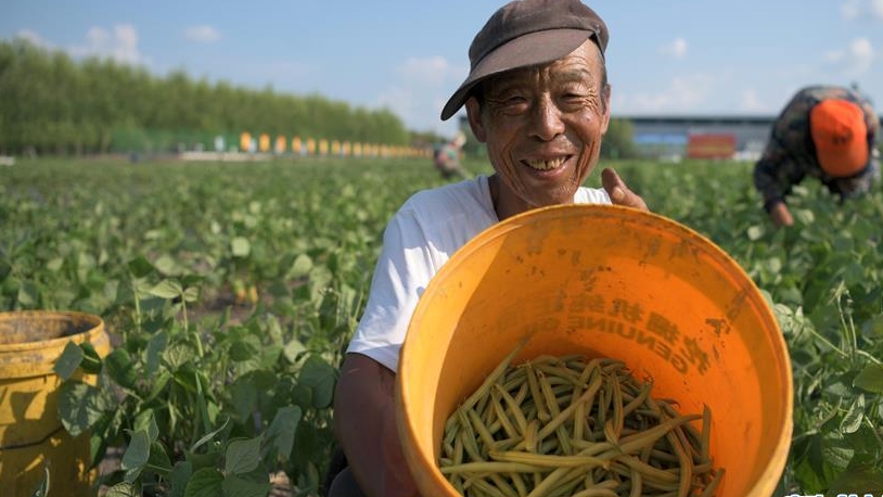 7月14日,在克東縣昌盛鄉(xiāng)青刀豆蔬菜種植示范基地,昌盛鄉(xiāng)安全村脫貧戶丁紹興展示剛摘下的青刀豆。