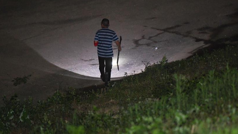 在岳陽市君山區(qū)的洞庭湖大堤上,工作人員在夜晚巡堤查險。