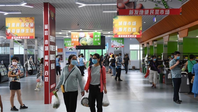 工作人員在新發(fā)地批發(fā)市場周轉(zhuǎn)新區(qū)對進(jìn)場車輛進(jìn)行取樣。